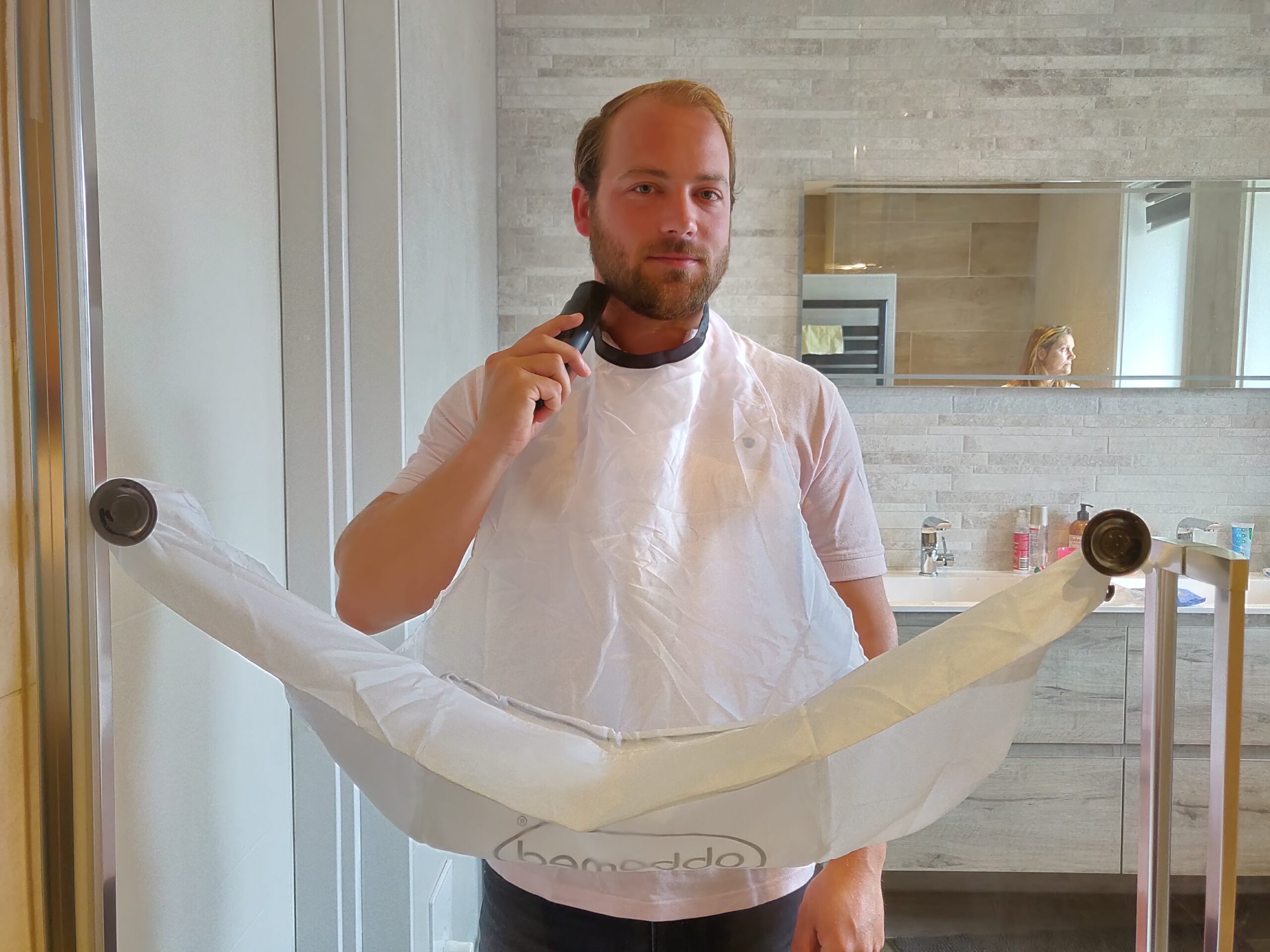 • Le tablier attrape tous les poils de barbe lors du rasage.