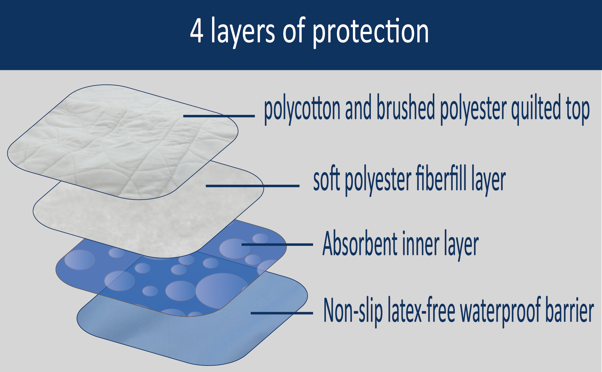 - 4 couches de protection : polycotton deluxe et polyester brossé premium avec top matelassé, couche en polyester doux fibré, couche interieure absorbante, et barriere anti glisse waterproof avec absorbance maximum jusqu’à 3.4 litres.