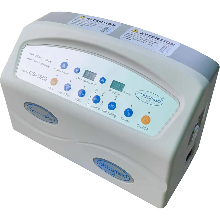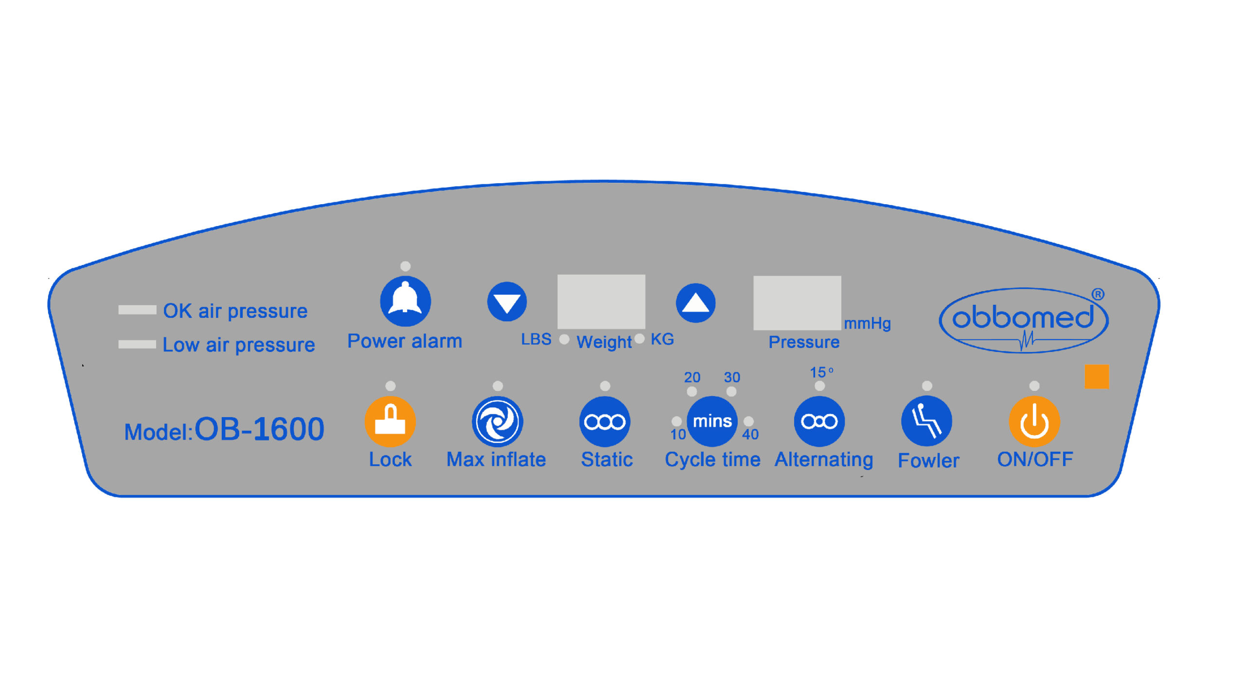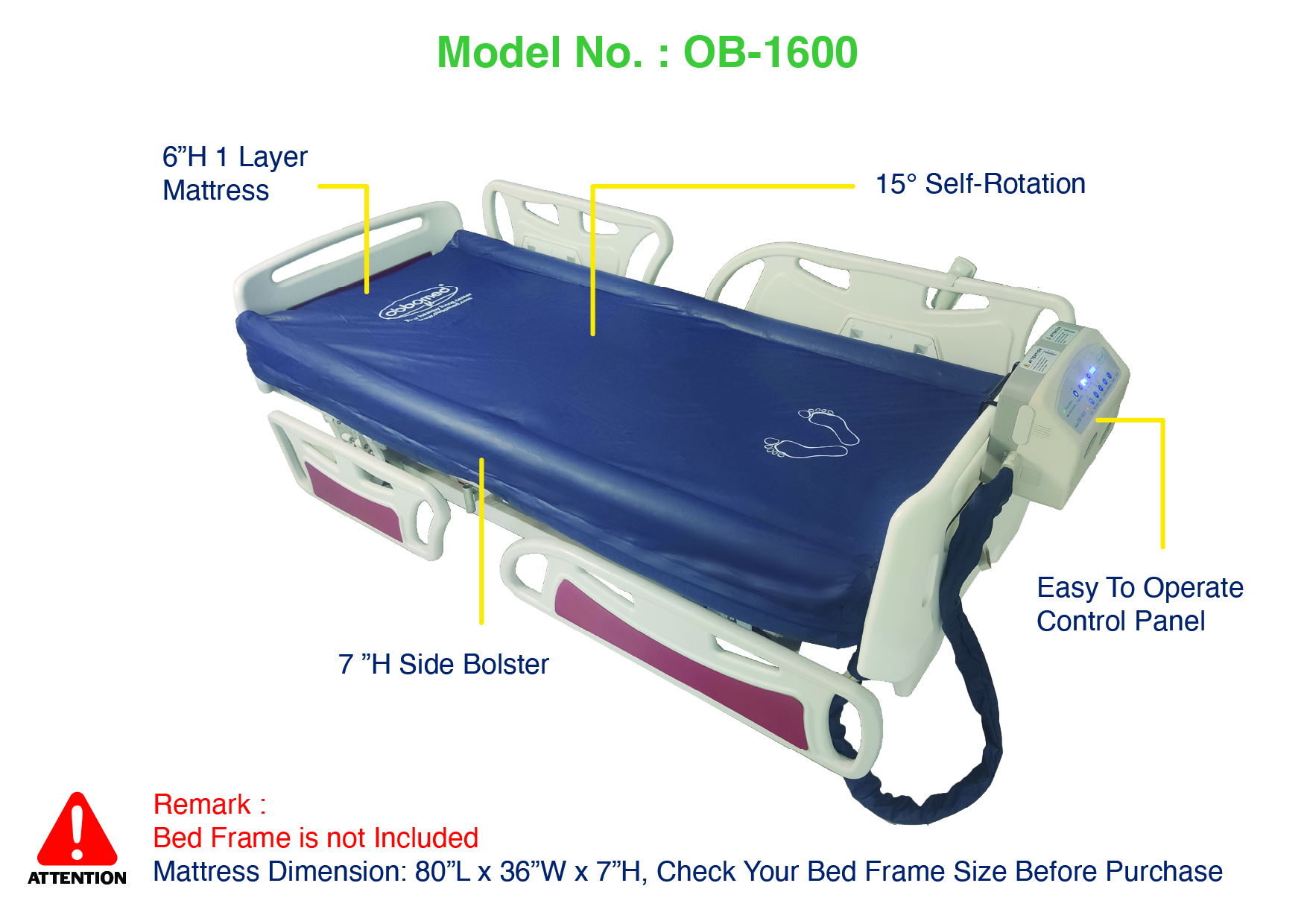 The OB-1600 is a 6-inch deep mattress made with a single air layer to provide alternating pressure for the patient. It has 7-inch high side bolsters that act as barriers to help reduce the chance of rolling out of the bed. The system includes an easy-to-use control panel, which lets caregivers adjust air pressure, select modes, and view alerts.
