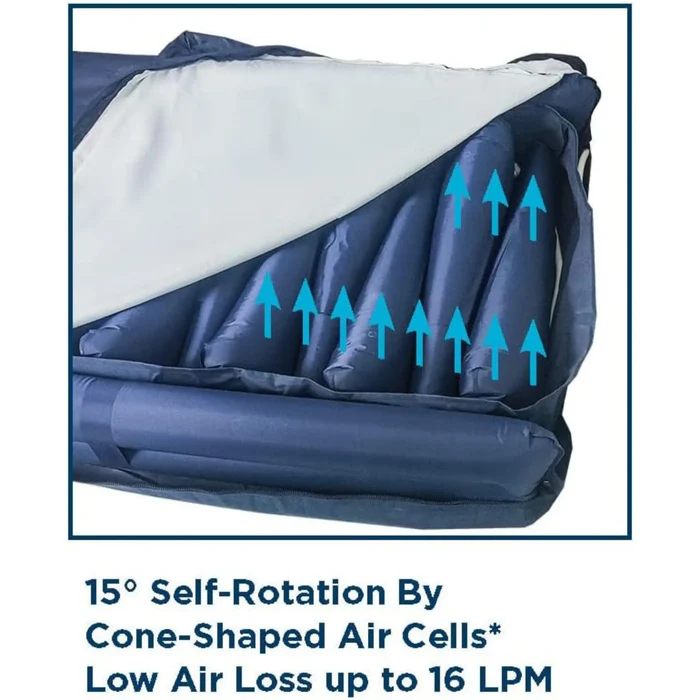 The Specialized air cells inflate and deflate to gently rotate the user by 15 degrees. This wave-like motion redistributes body weight, relieves pressure points, stimulates blood circulation, and assists in preventing bedsores.